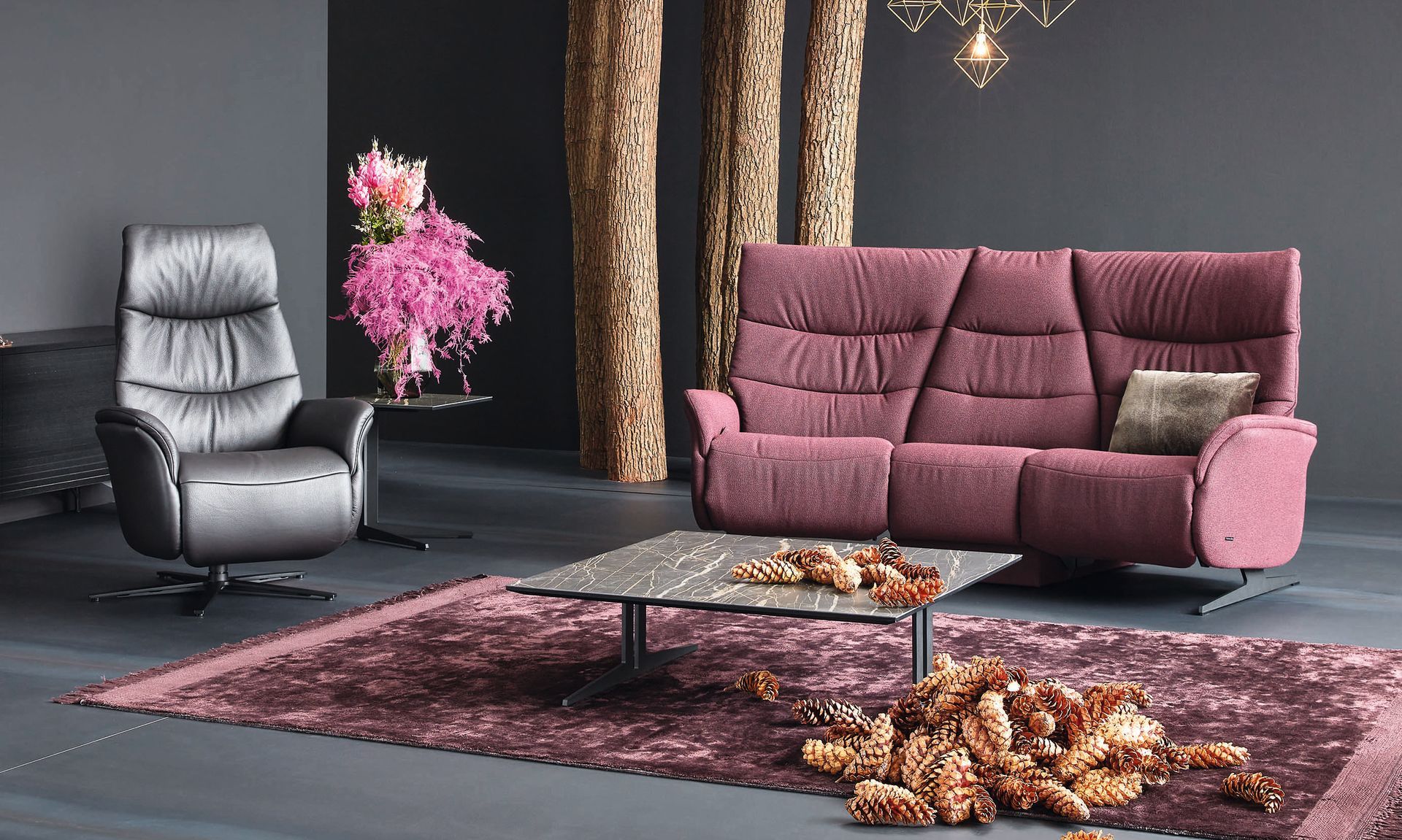 A unique battery system from Himolla is available on the sofas and recliners giving cord free electric reclining and easy recharging via a remote charging station.
